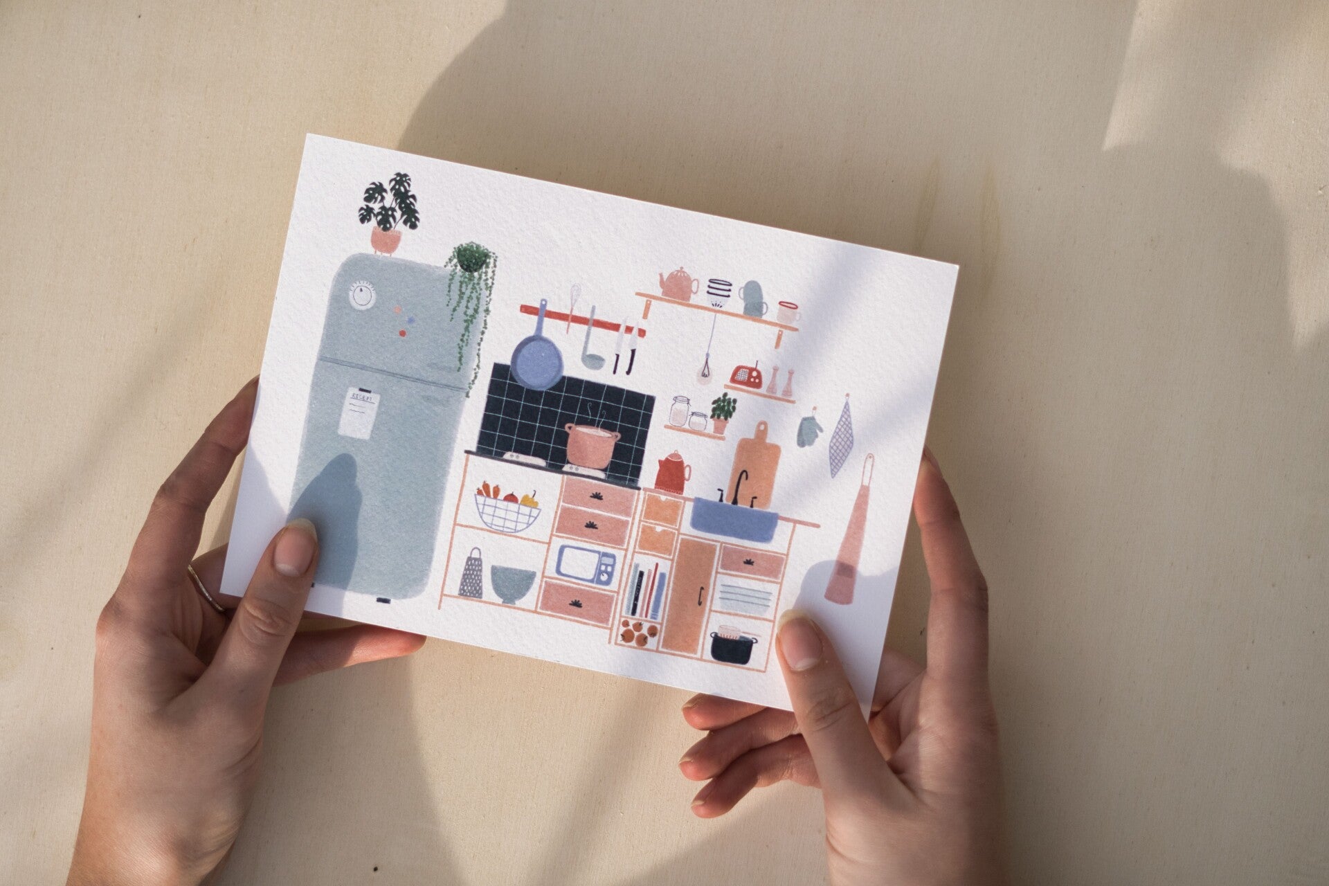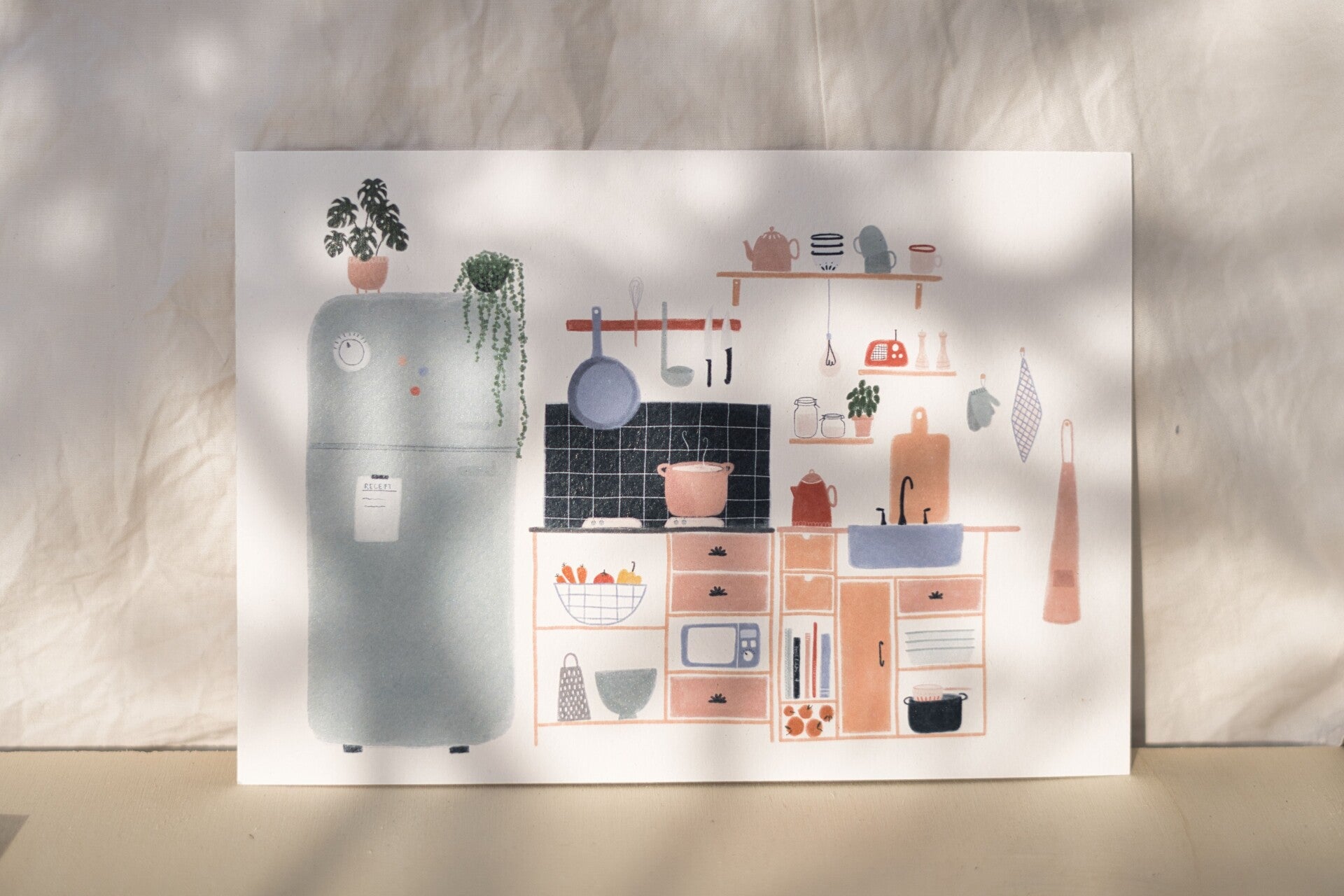 Op deze mini-poster staat een illustratie van een gezellig keukentje. De keuken staat vol met pannen, planten, groenten en servies. Doe de poster in een lijstje of hang de poster los op. Deze art print maakt elk hoekje gezelliger!