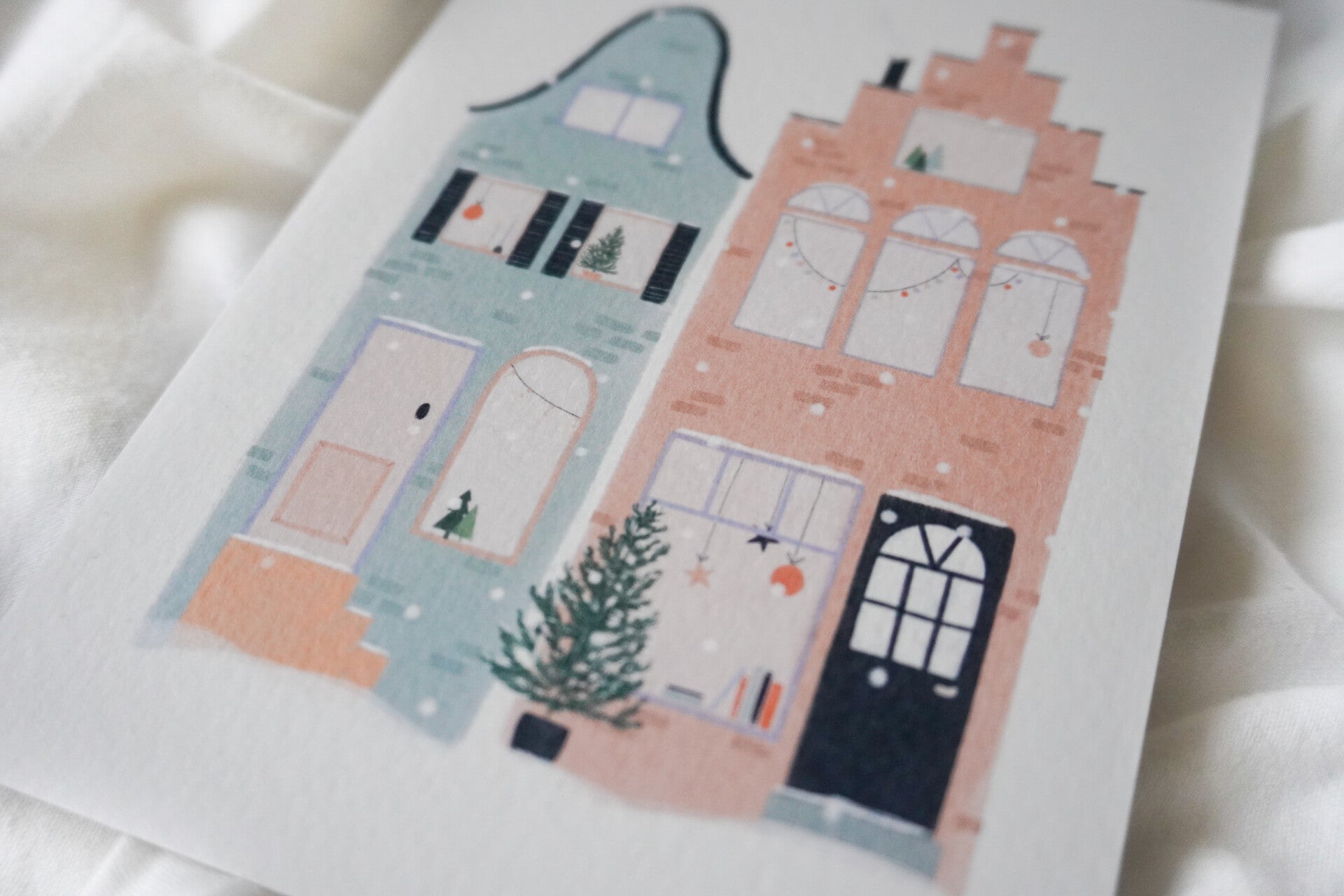 De kerstkaarten zijn gedrukt op dik A6 structuurpapier, wat lijkt op aquarelpapier. De achterkant is blanco met een klein logo. De kaarten hebben een FSC keurmerk.